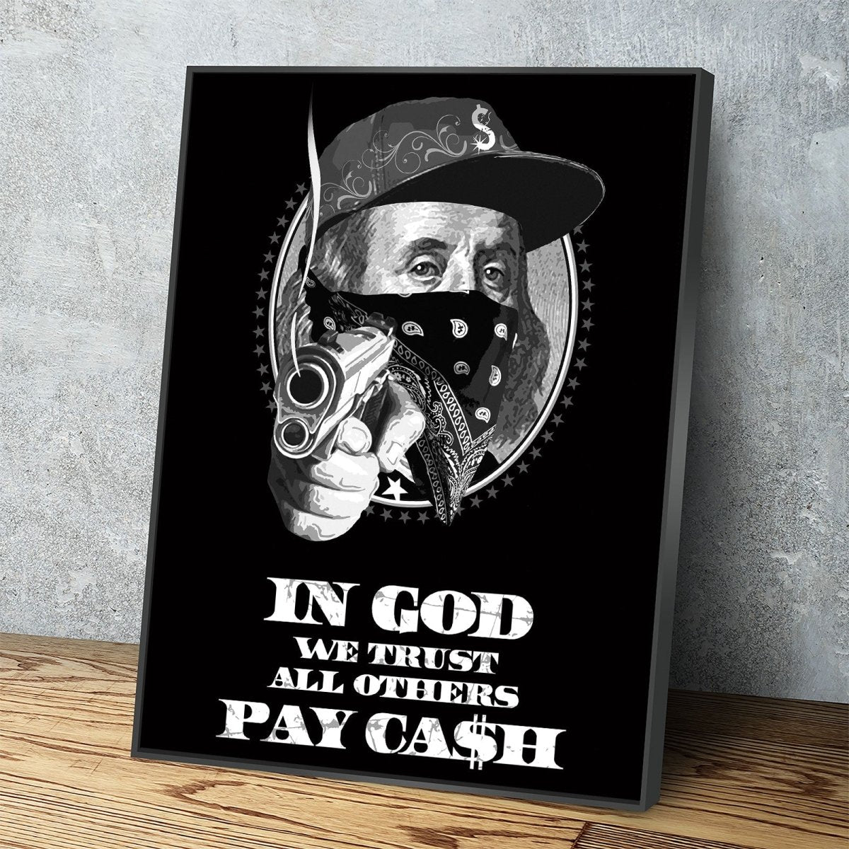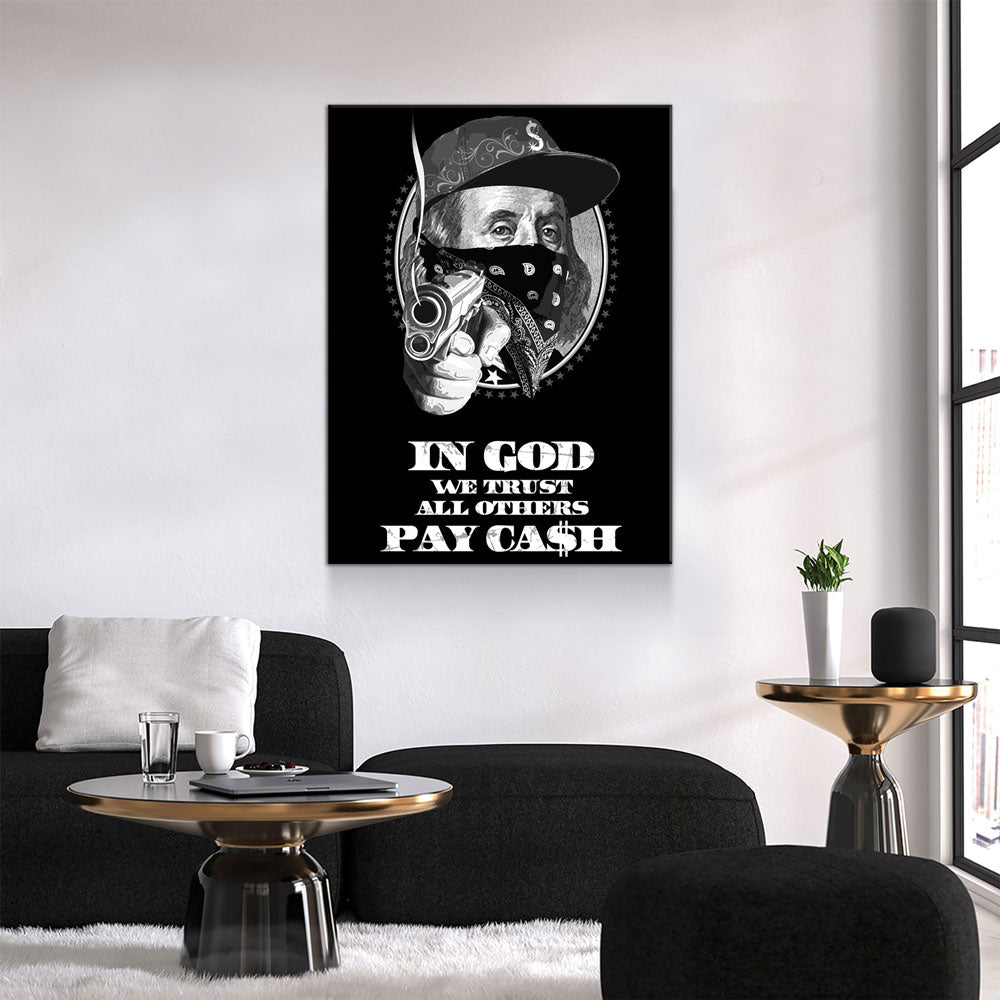 In God We Trust All Others Pay In Ca$h Canvas Wall Art, Ben Franklin Gangster Art, Hustle Print